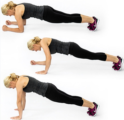 기본 플랭크 자세에서 한쪽 팔꿈치를 짚고, 이어 반대쪽 팔꿈치로 내려갑니다. 다시 한쪽 손바닥을 짚고, 반대 손바닥을 짚어 원래 자세로 돌아옵니다. 좌우를 번갈아가며 반복합니다.